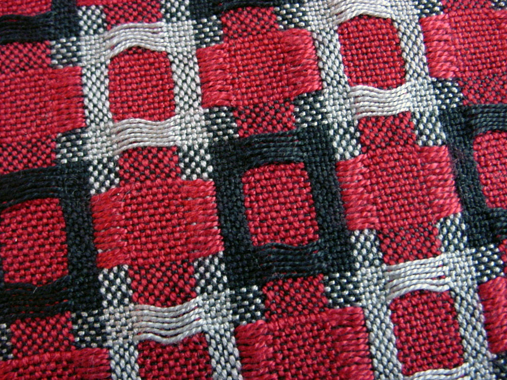 Barb came home from a trip to Italy this year, inspired to weave the red, black and gray tencel and cotton placemats. They are elegant, and sleek, an 8-harness pattern that she says is very simple to thread.